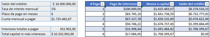 | Número de cuota. | Pago intereses. | Abono a capital. |