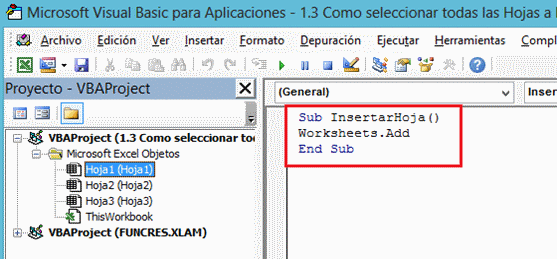 - En la segunda línea estamos utilizando del Objeto Worksheets, el Método Add con el cual se indica que se insertará una nueva hoja. Al tener esta macro en la Hoja1, la hoja a insertar quedará ubicada antes de esta hoja.