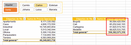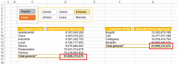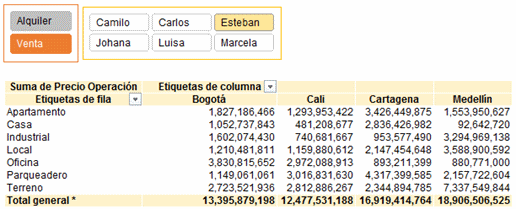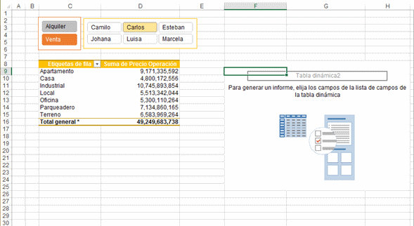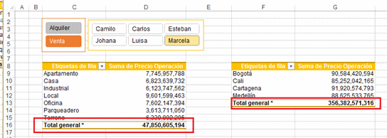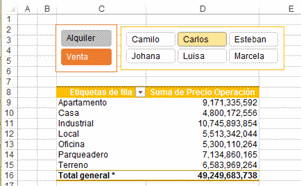 Adicionalmente tenemos dos cuadros de segmentación que corresponden a los campos Operación y Vendedor con los cuales se facilita demasiado la consulta de los datos de la tabla dinámica simplemente seleccionando cualquiera de las opciones de ambos cuadros de segmentación.