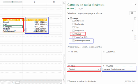 Se trata de un esquema donde tenemos en la tabla dinámica los distintos tipos de inmuebles en Filas y en Columnas están los valores para cada una de las ciudades.