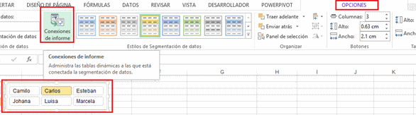 Esto ocurre debido a que no hay una “conexión” entre los cuadros de segmentación y la Tabla 2, y para realizar dicha “conexión” seleccionamos cada cuadro de Segmentación y en la Ficha Opciones encontramos Conexión de informe:
