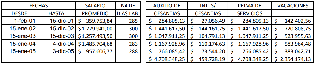Dejamos una tabla en la que la Sala laboral de la Corte suprema de justicia (SL17830-2016) liquida vacaciones y prestaciones sociales de un docente en aplicación del artículo 102 del CST.